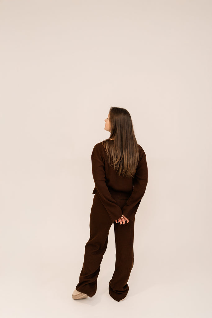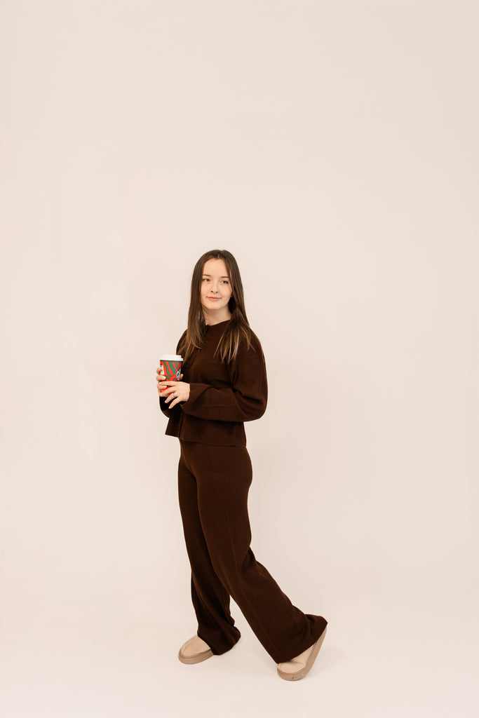 Elevate your loungewear game with our cozy matching set. Crafted for comfort and style, this one size outfit features a relaxed-fit, long-sleeve, buttoned top paired with soft, stretchy pants. The earthy ivory and chocolate tones give a warm, versatile vibe perfect for everyday wear. Made from a soft fabric blend, it's ideal for lounging or casual outings. Pair it with your favourite sneakers for an effortlessly chic look.