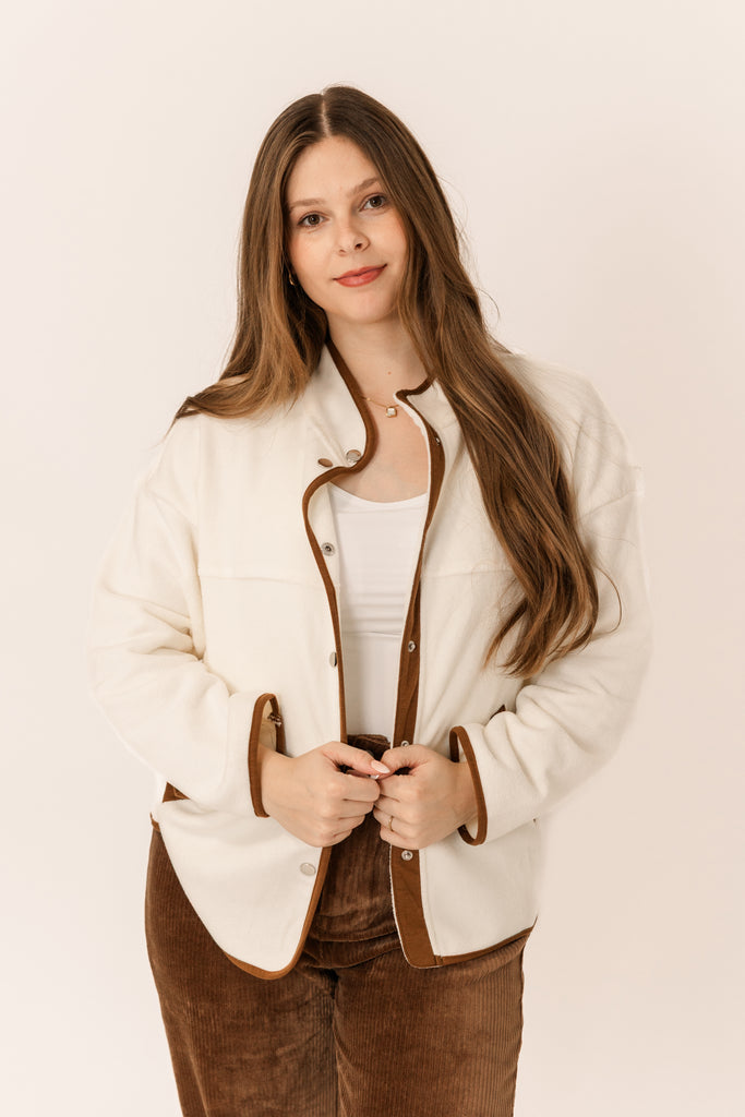 Cozy, clean, and effortlessly chic — The Aspen Jacket combines soft fleece comfort with rich brown trim for a polished, mountain-inspired look. Featuring snap buttons and a relaxed fit, it’s the perfect layer for crisp mornings, coffee runs, or weekend getaways.