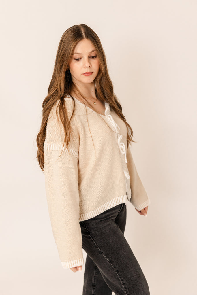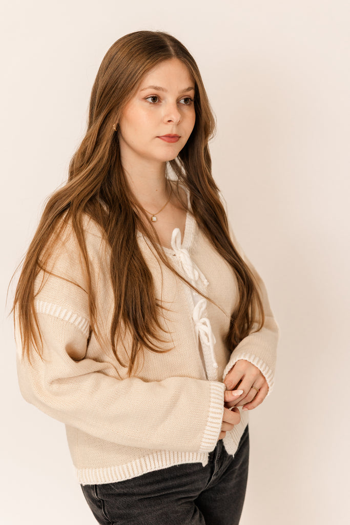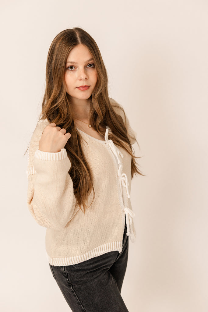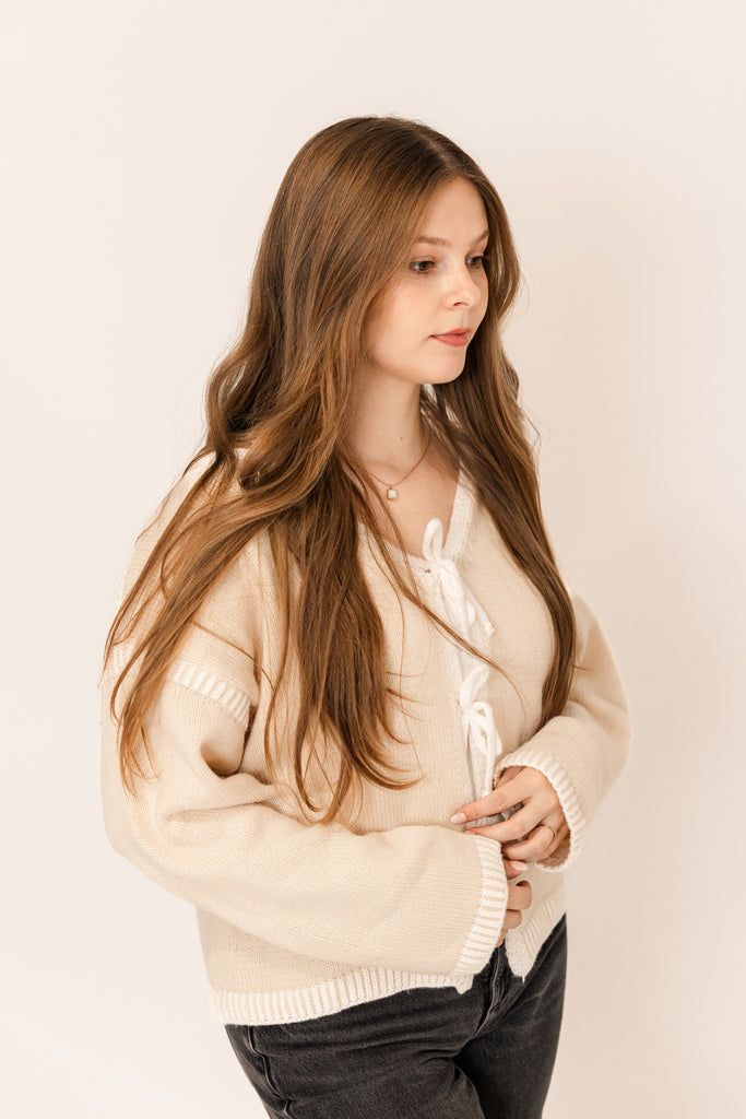 Playful, feminine, and perfectly cozy for the season. This creamy tie-front cardigan adds a touch of charm with its soft texture and delicate bow details. Whether you’re dressing it up for a festive night out or keeping it casual by the fire, it’s the kind of piece that feels effortlessly romantic — just like a moment under the mistletoe. ❄️