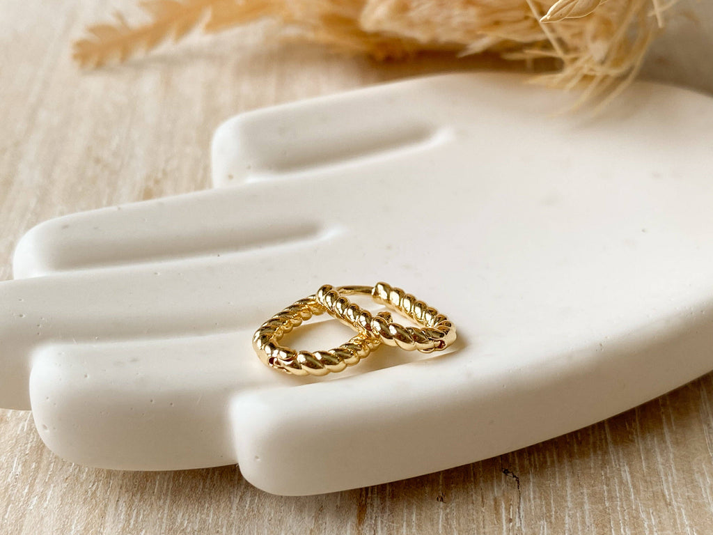 A "U" shaped small hoop that has a twisted rope appearance! These nickel free and 18K gold plated studs are the perfect accent for another earring, or a subtle stand alone piece.