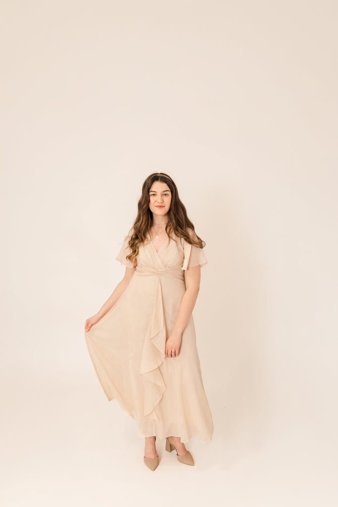 A timeless holiday piece that captures effortless elegance. The Ivory Glow Dress features a soft shimmer fabric that drapes beautifully with every step, flutter sleeves for a romantic touch, and a cascading ruffle hem that adds graceful movement. Perfect for winter weddings, Christmas parties, or New Year’s celebrations — this dress embodies understated glam with a hint of sparkle.