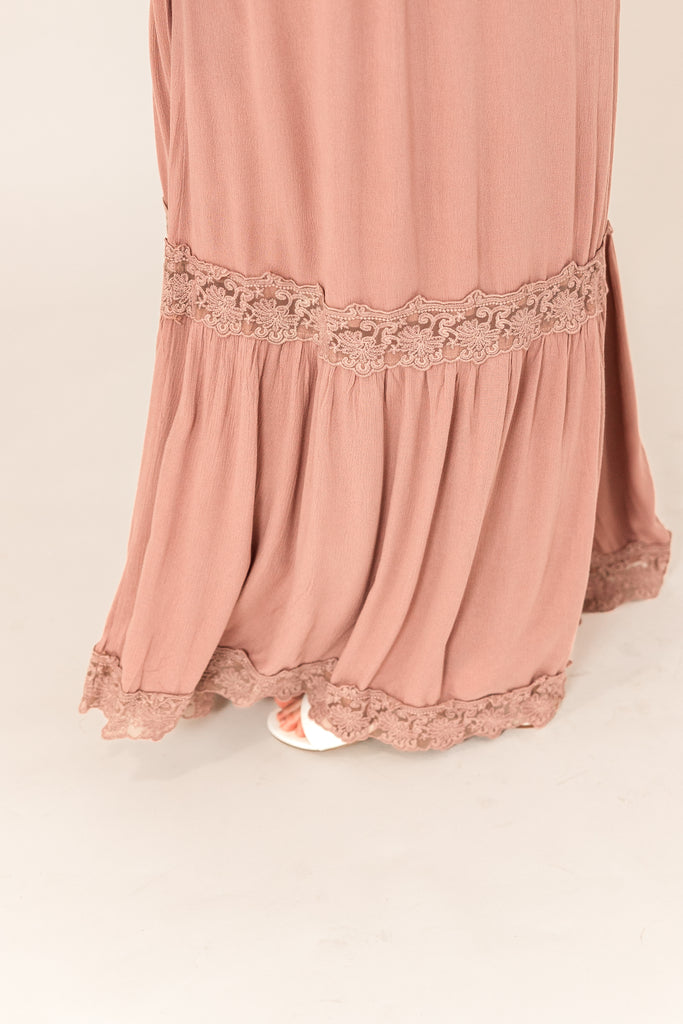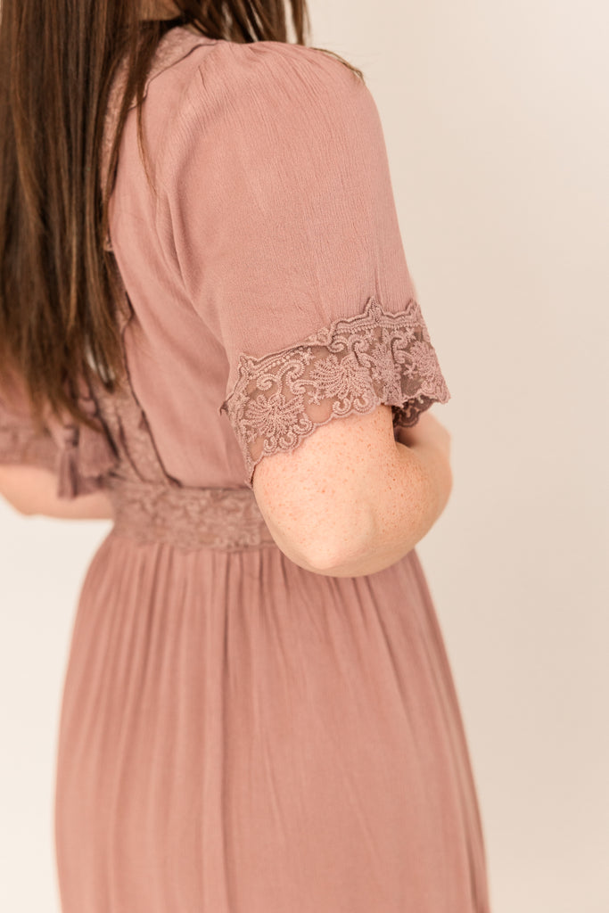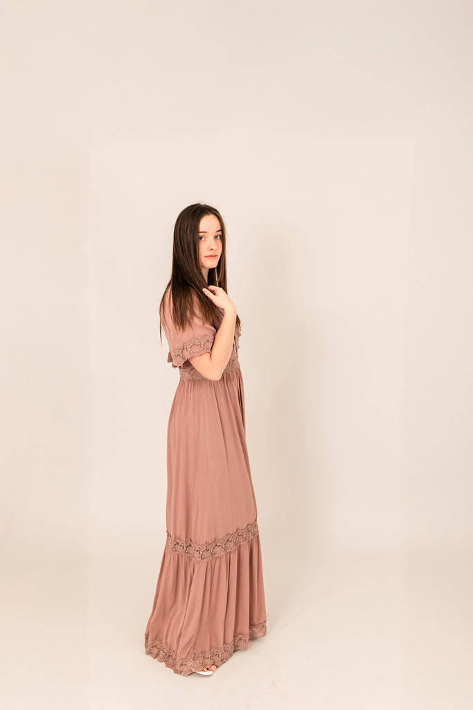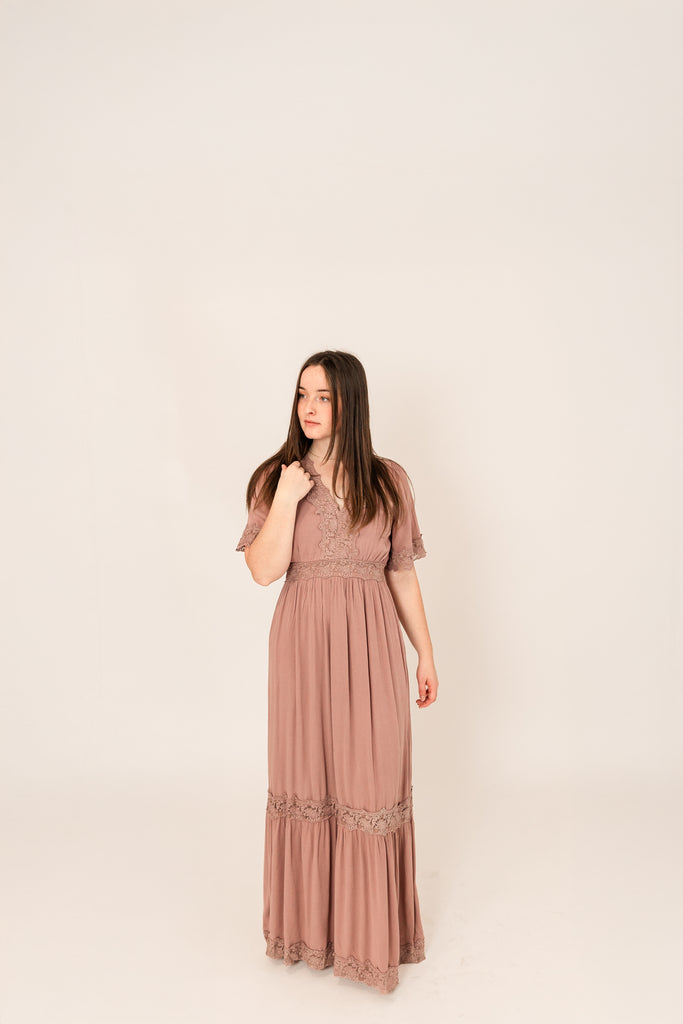Introducing a graceful, lace-trimmed, maxi dress that effortlessly blends elegance and charm. This mauve dress features a flattering V-neckline and short sleeves, creating a sense of refinement and sophistication. The delicate lace trim around the neck, waist, sleeves, and skirt adds a touch of romantic allure.